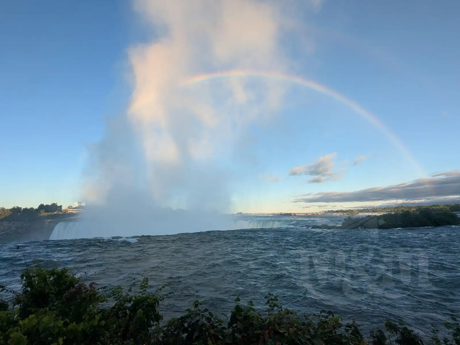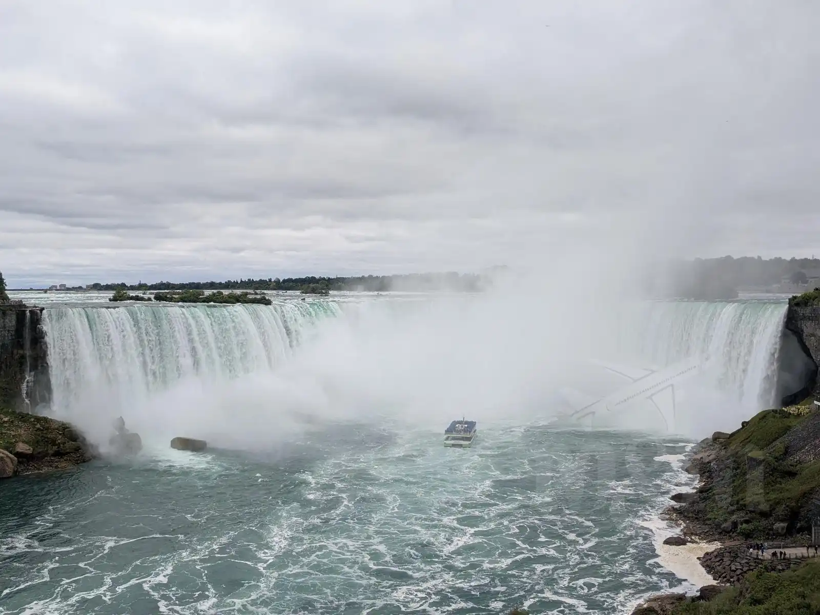 Niagáry jsou vskutku impozantní, hlavně Horseshoe Fall of Canada. American fall je také pěkný, ale proti tomu kanadskému vypadá je to takový slabší odvar. Přeskočili jsme turistické atrakce, kterých je v okolí hodně (i když projížďku lodí přímo pod vodopády jsme dost zvažovali) i přechod mostu na Americkou stranu (jedno čekání na hranici USA předchozí den nám stačilo). Ale i tak jsme si výhled dost užili, zejména když jej na konci završila duha, která se nad vodopádem objevila.