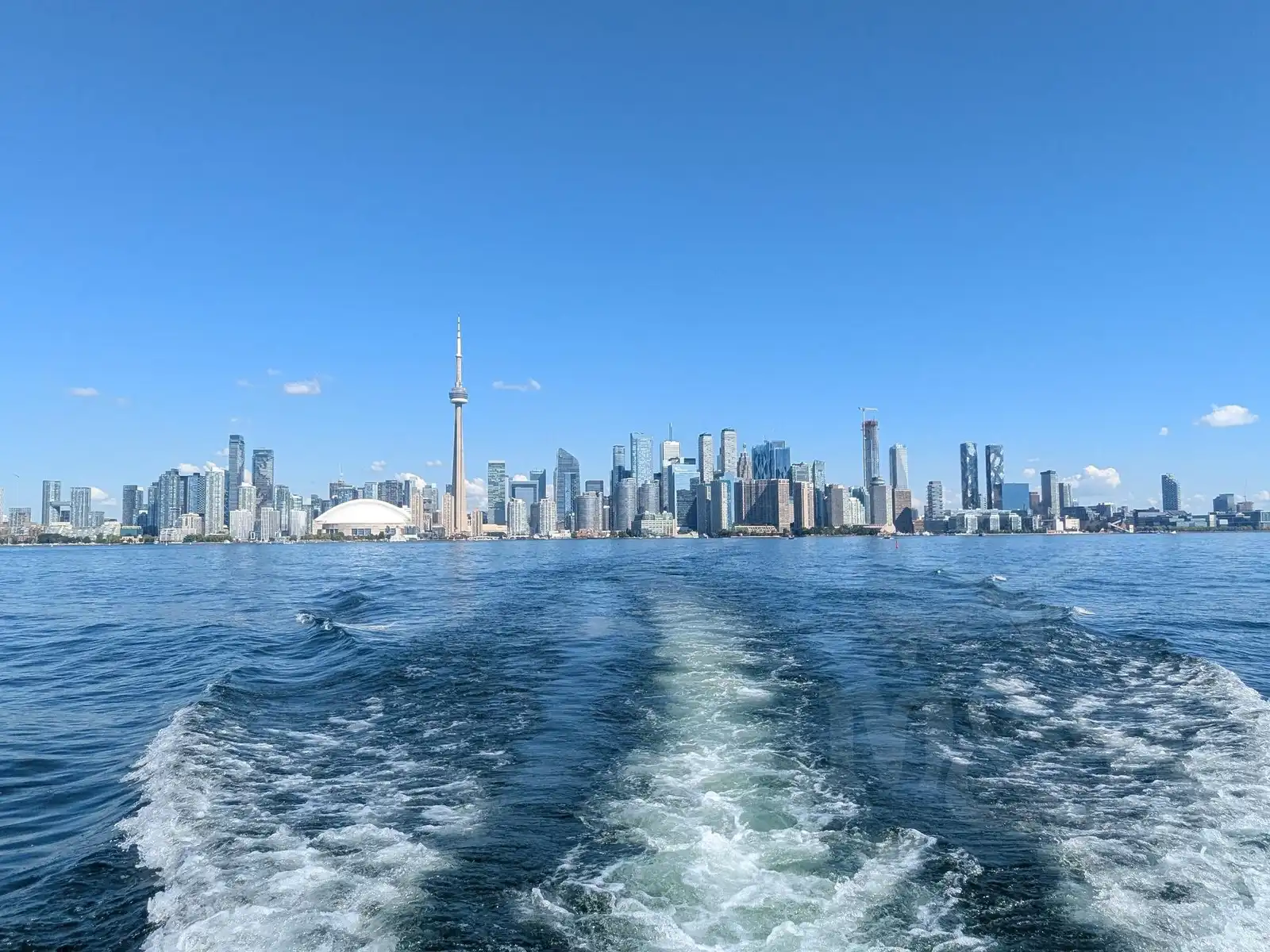Uložili jsme zavazadlo do úschovny u nádraží a došli na nábřeží, odkud jezdily veřejné trajekty na ostrovy. Ovšem trefili jsme zrovna více než hodinovou pauzu, kdy žádný trajekt nejel. Neměli jsme úplně moc času, odpoledne jsme museli být na letišti, takže jsme to chtěli vzdát, ale naštěstí jsme hned vedle narazili na Water Taxi, které se nám původně zdálo moc drahé, ale zjistili jsme, že to není až tak hrozné (ano, trochu dražší na cestu tam, ale na cestu zpátky lze zdarma využít veřejný trajekt). Takže na ostrovy jsme se nakonec dostali. Z ostrovů je na Toronto impozantní pohled.