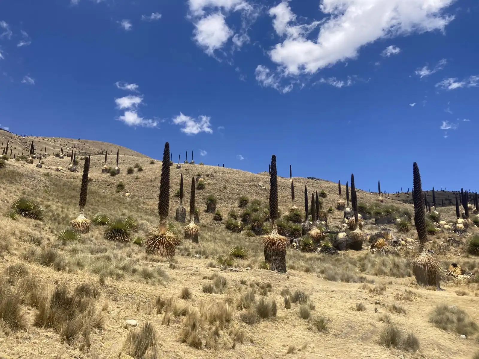 Před dojezdem k ledovci Pastoruri se projíždí zvláštní krajinou, zelenou travnatou pampou. Je to ve velké nadmořské výšce, přes 4000 m.n.m., ale přes den tam teplo. Stromy tam nerostou, jen nízké keře, kaktusy a zvláštní vysoká rostlina, Puje Rajmondova. Měli jsme cestou několik zastávek na focení a průvodce o ní mluvil. Název jsme chytili, popis moc ne, ale informace jsme si pak dohledali.