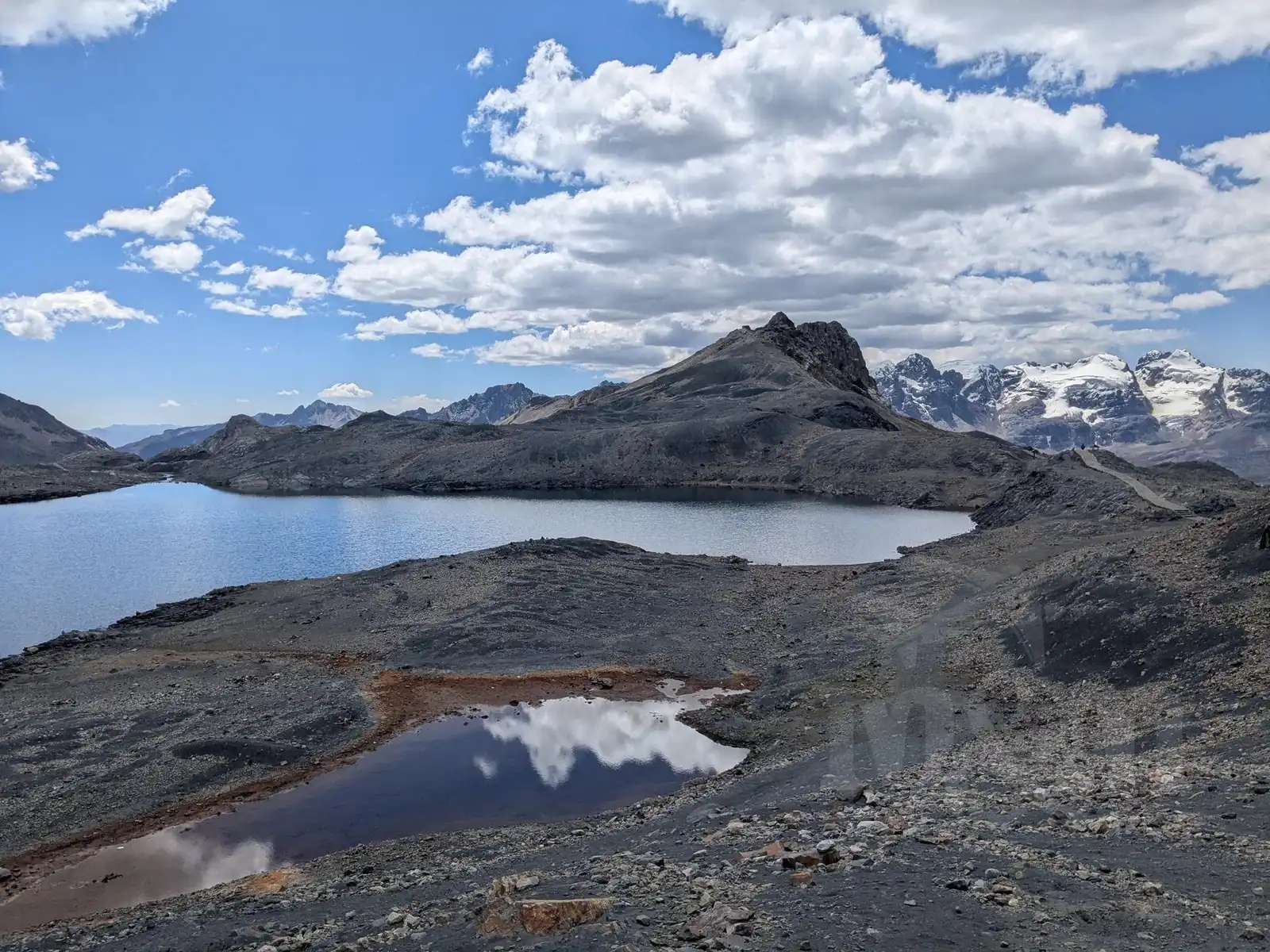 Další den už jdeme sami, druhá polovina našeho Společenstva se rozhodla trek dnešní 3. den dojít (což určitě z basecampu Alpamayo jde, zvlášť bez laguny Arhuaycocha - ale tam my ještě jít chceme). My to jdeme trochu víc na pohodu, ráno si vyjdeme na východ slunce k laguně (díky tomu, že slunce vychází za horami, je u ní východ slunce celkem pozdě). Od ní je také výhled na horu Artesonraju, známou z loga firmy Paramount. Teprve pak si dáme snídani, sbalíme a vycházíme. Čeká nás už jen sestup dolů. Ten víme, že jde rychleji, ale večer z něj budou více bolet nohy. Většina cesty je podél potoka, který občas tvoří pár jezer. Na jednom místě musíme brodit. Ujdeme přes 20km (800 metrů dolů) a večer končíme asi 5km (ale taky 600 výškových metrů) před koncem treku. Stan stavíme vedle cesty, trochu skrytý za kamením.