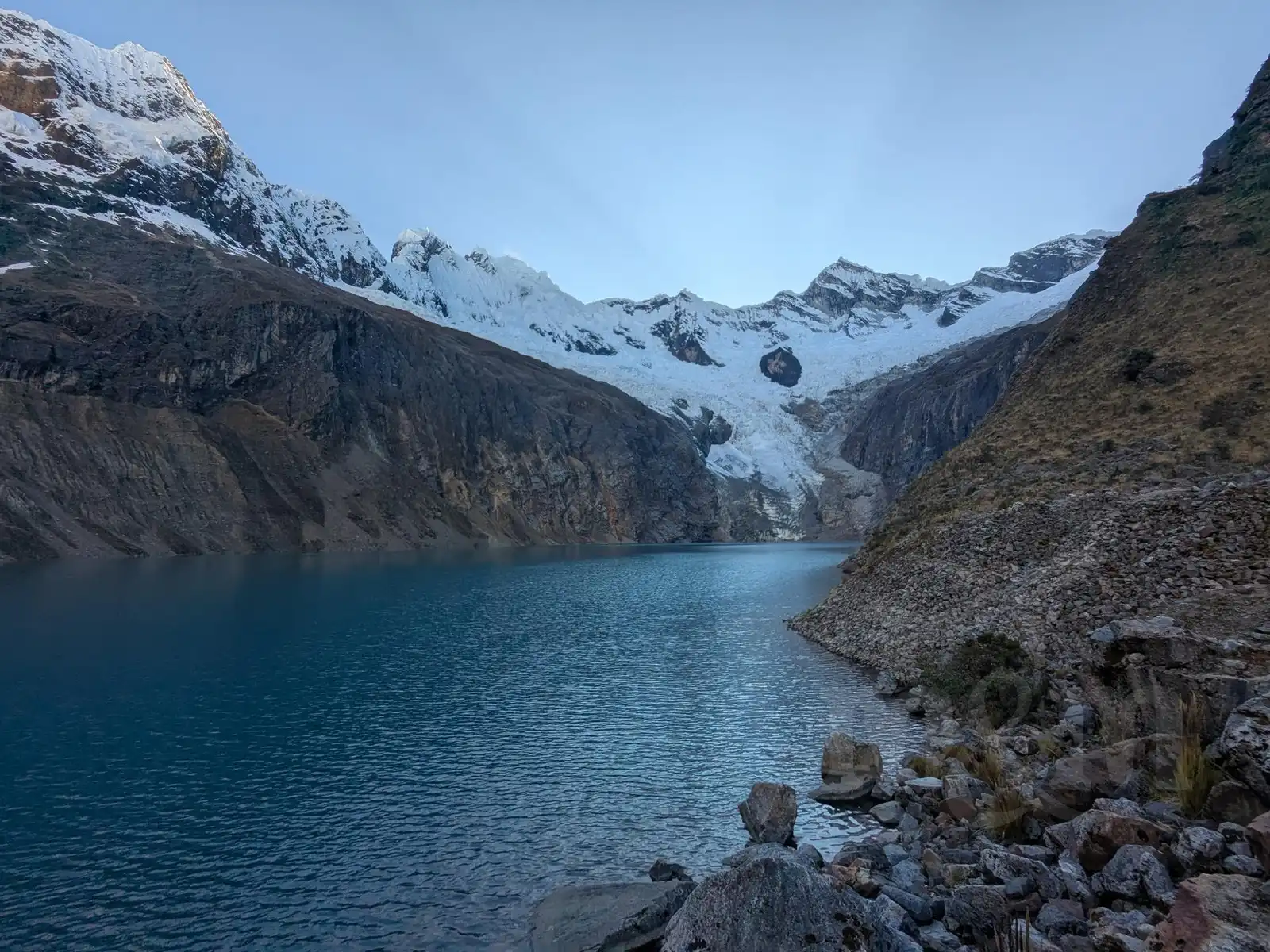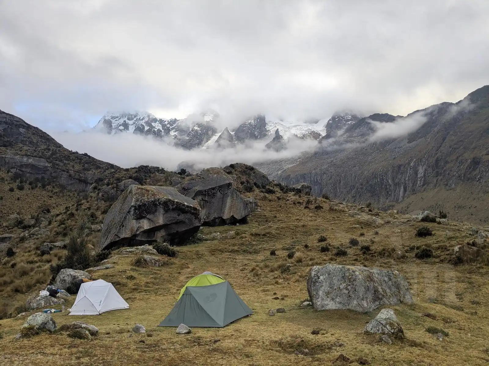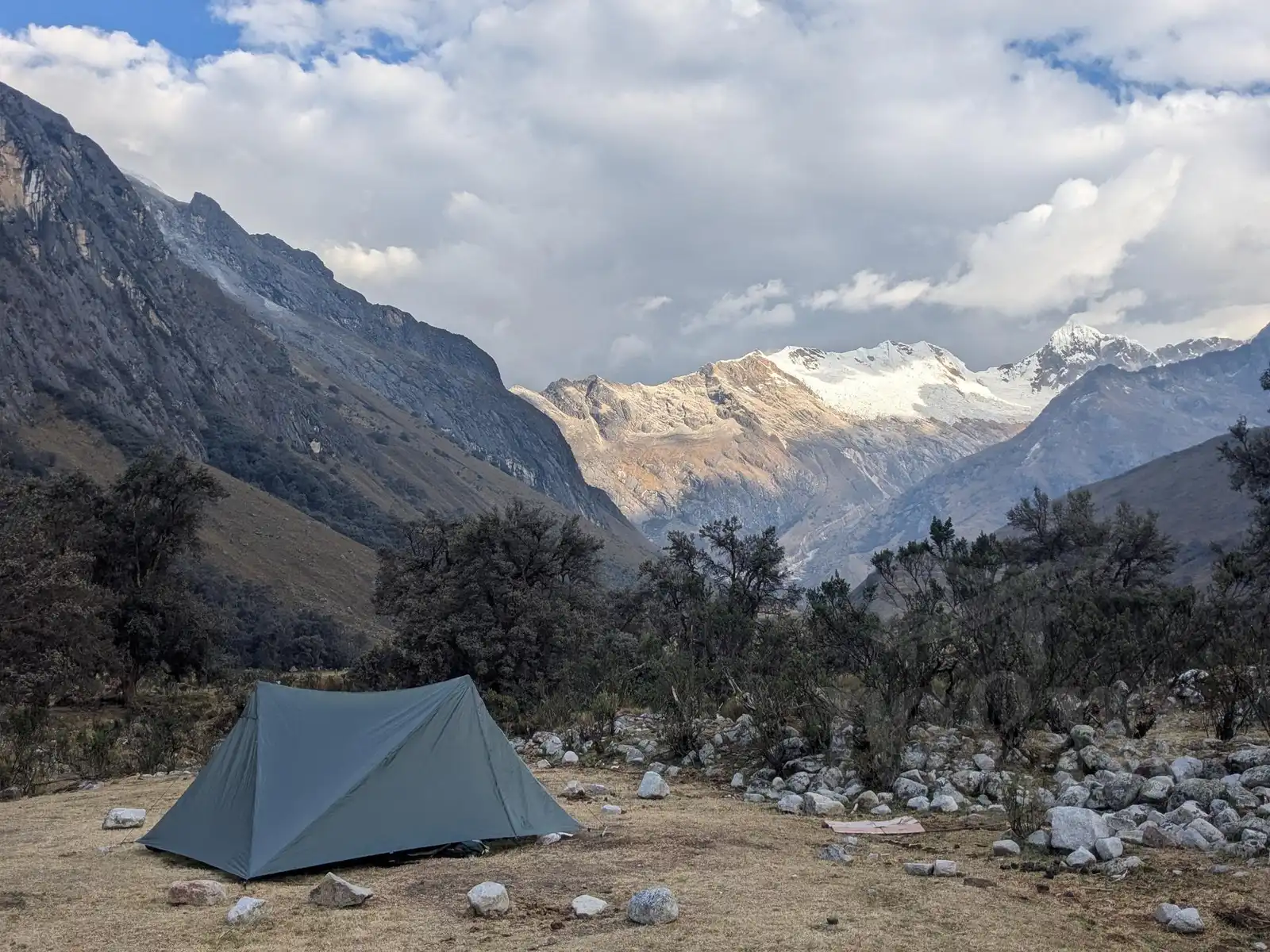 Tady nás trochu zradily (jinak úžasně užitečné) mapy.cz. Podle nich to mělo být jen cca 200 výškových metrů. To ale rozhodně nebylo. Cesta vede z velké části podél vrstevnic, které zřejmě nejsou úplně přesné… Zkrátka museli jsme toho vystoupat o dost víc, než jsme počítali (a než by se nám líbilo) a k basecampu Alpamayo jsme došlu opět z posledních sil. Océane i Fernando tam byli o dost dřív a zvládli se vyjít podívat i k blízké laguně Arhuaycocha, my si jí necháváme na ráno. Údolí je hluboké, slunce zachází za hory brzy, takže opět je celkem rychle zima. Peruánec se šel vykoupat do blízkého potoka, který vytéká z ledovcové laguny, což obdivujeme, ale nepřidáváme se. My si uvaříme jídlo, postavíme stan a po chvilce povídání venku (ve všech vrstvách oblečení co máme) opět zalézáme do spacáku.