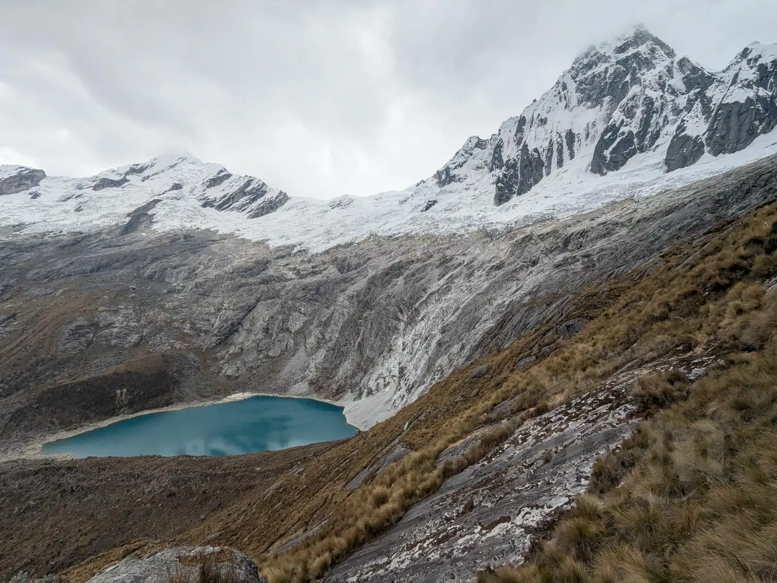 Pak jsme konečně začali s výstupem k laguně Churup. Cestou jsou krásné výhledy, ale celkem rychle nám docházel dech. Aklimatizovaní jsme nebyli ještě zdaleka dost a udělali jsme rovnou několik chyb (příliš rychlé tempo s málo zastávkami, málo tekutin a skoro žádné jídlo), takže když nám chybělo ještě pár set výškových metrů, seriózně jsme zvažovali, že to vzdáme. Na pokračování jsme měli různé názory a nemohli jsme se na nich shodnout. Nakonec zvítězila možnost pokračovat, už to nemělo být daleko, ale to nejprudší část nás teprve čekala. Posledních 100 metrů je spíše lezení, s lany přidělanými ve skále na přidržování. Zpátky už to bylo horší než nahoru, takže jsme to po delší době dolezli. K laguně jsme se doplazili s vyplazeným jazykem po třech a půl hodinách. Je moc hezká, ale prvních 10 minut tam jsme se jen vydýchávali.