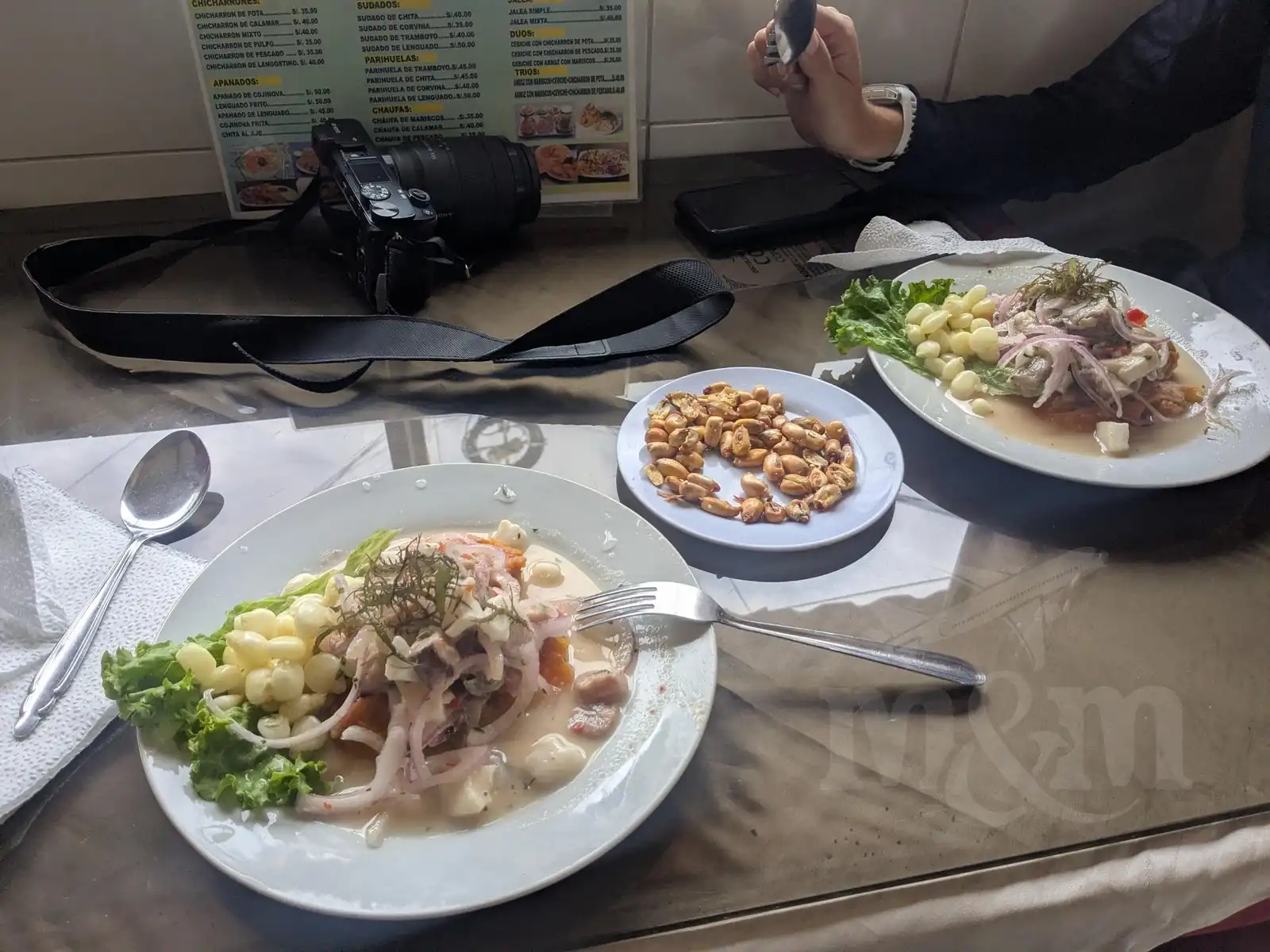 Oběd zařídíme hned po příjezdu do Huarázu, zapadneme do blízké cevicherie. A objednáme si denní menu, což tady znamená ceviche (typické latinskoamerické jídlo, syrová ryba marinovaná v citrónové šťávě, podávaná s cibulí) jako předkrm a rybu s maniokem jako hlavní jídlo. Je toho hodně, ale máme hlad, takže to zvládneme (i Magda 😉). Dostáváme k tomu ještě velkou sklenici skvělého ovocného džusu. Denní menu mimochodem v papírovém jídelníčku vůbec není, ale je napsané na tabuli v restauraci a místní nic jiného neobjednávají. Kdybychom si stejnou kombinaci jídel objednali z jídelníčku, stála by o dost víc, než 40 PEN (cca 280 Kč), co jsme celkově zaplatili.