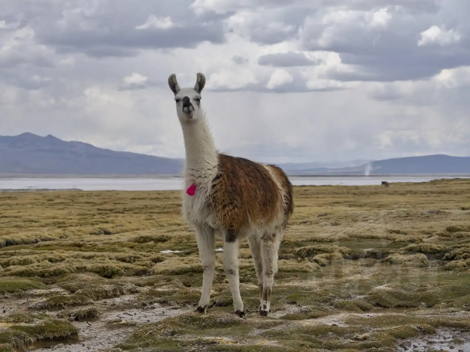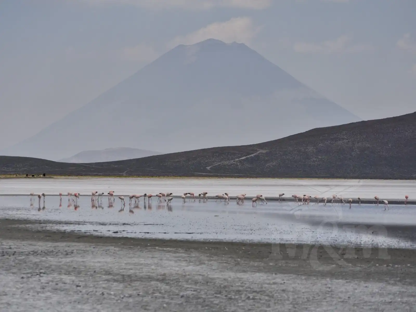 Oheň výlet nezastavil, ale trochu narušil výhledy na sopky. Na první zastávce nebyl vidět skoro nic než dým v dálce a ve vzduchu byl cítit kouř. Cesta pokračovala po jedné z nejhorších silnic, jaké jsme kdy zažili – a to už je v Peru co říct! Po hodině natřásání jsme dojeli k malé vesnici, kde nám zkusili prodat pár suvenýrů. Pak už se ale před námi otevřela solná laguna, na které se pásly lamy. Byl to nádherný pohled, který ještě umocnili plameňáci na hladině jezera se siluetou sopky v pozadí. Nafotil jsem spousty fotek a měl jsem potom velký problém vybrat ty nejlepší. Na termální bazének už nám sice nezbyl čas, ale i tak se nám tato oblast moc líbila.